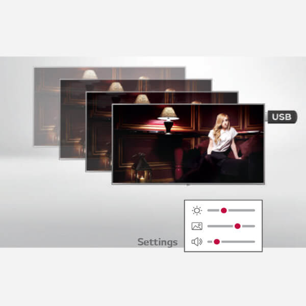 USB data cloning makes managing multiple displays more efficient for optimal operation. No need to set up each display one by one, data can be copied to a USB in one display, data will be distributed to other displays through a USB plug-in.